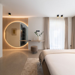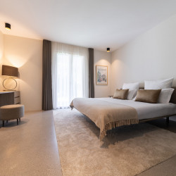 Villa Giulia accommodates 6 guests across three bedroom suites and is spread over 3 levels. The main level is the heart of the villa and the spacious living area is filled with natural light from wide windows and features a beautifully restored original fireplace. The open-plan layout connects seamlessly to a modern kitchen and dining area and outside, enjoy wide terraces, perfect for al-fresco dining and relaxed gatherings overlooking the gardens and lake.