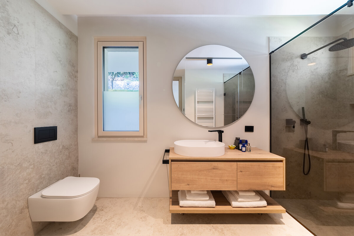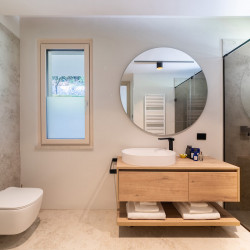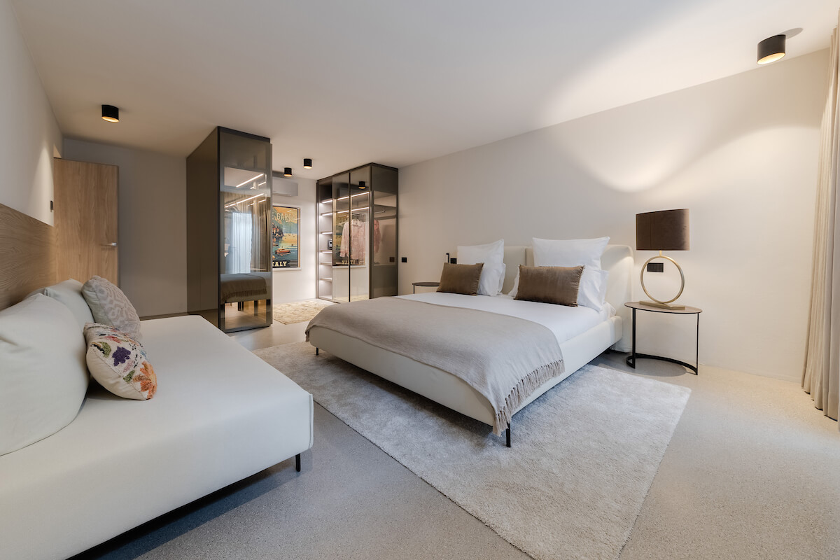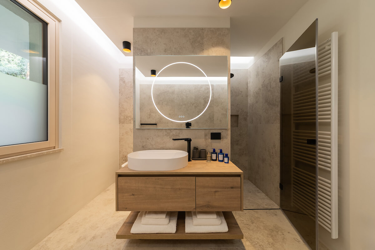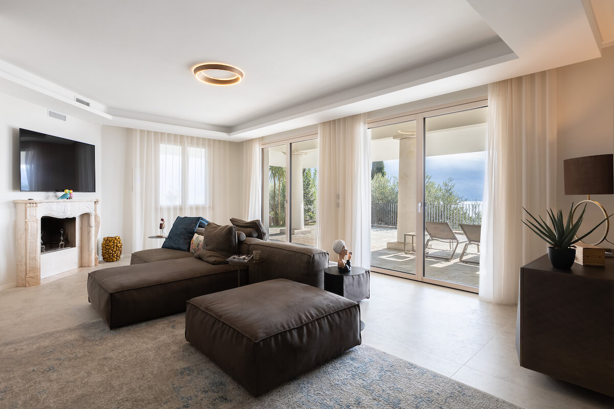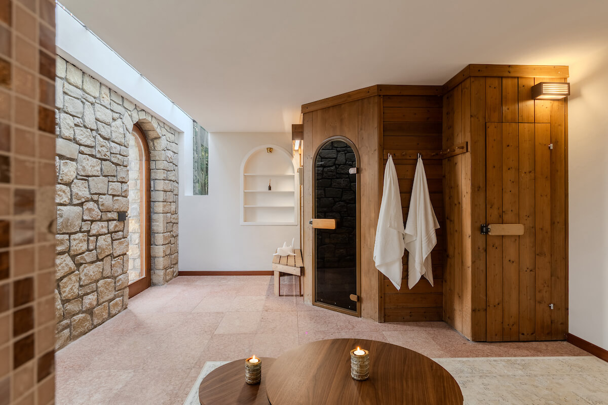 On the lower level, with direct access from the garden, the villa offers a dedicated wellness and relaxation area complete with a sauna and a jacuzzi shower.
