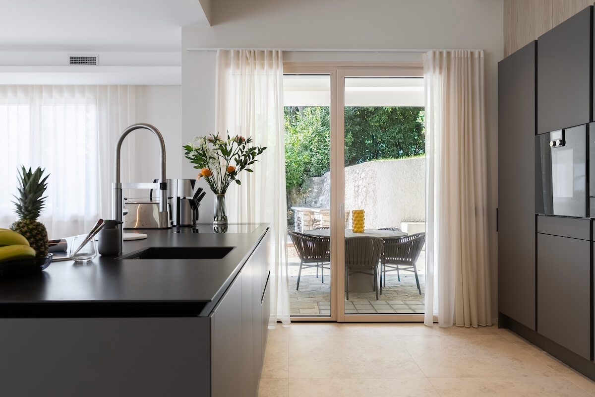 The villa features an excellent SieMatic kitchen, fully equipped with premium Gaggenau appliances. Outside, a barbecue area is perfect for relaxed summer grilling.