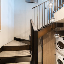 The mezzanine level features two bedrooms: a master suite with an en-suite bathroom complete with both shower and bathtub, and a double bedroom with its own en-suite bathroom with shower. On the lower level, you’ll find a spacious double bedroom, also with an en-suite bathroom with shower.