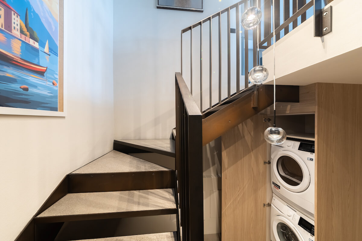 There is a laundry area available on the lower floor of the villa and features a washing machine and dryer.