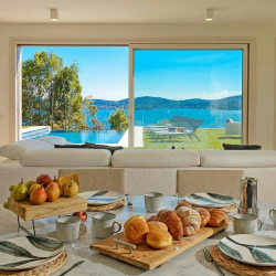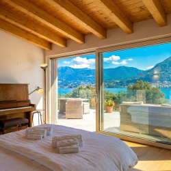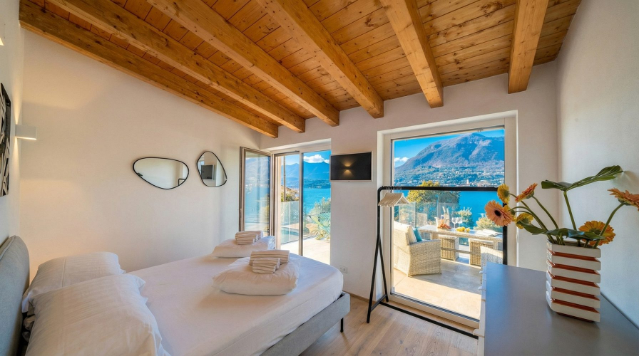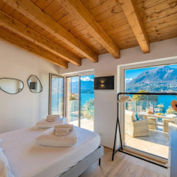 Upstairs you’ll find a second lounge area with a small kitchenette, plus two further double bedrooms. One of these has an en-suite bathroom and lake views, while the other has lake views and opens onto the terrace. The upstairs living area also includes a double sofa bed for the seventh and eighth guests.