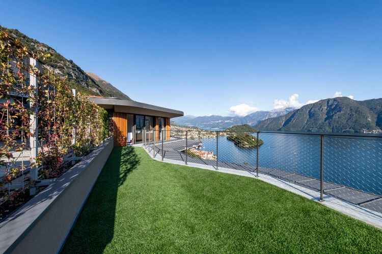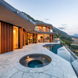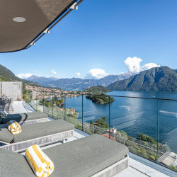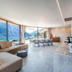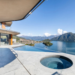 The terrace surrounds the villa and offers magnificent sweeping views over Lake Como below. The space is completed with an alfresco dining area, a 35 sqm infinity pool and a hot tub.