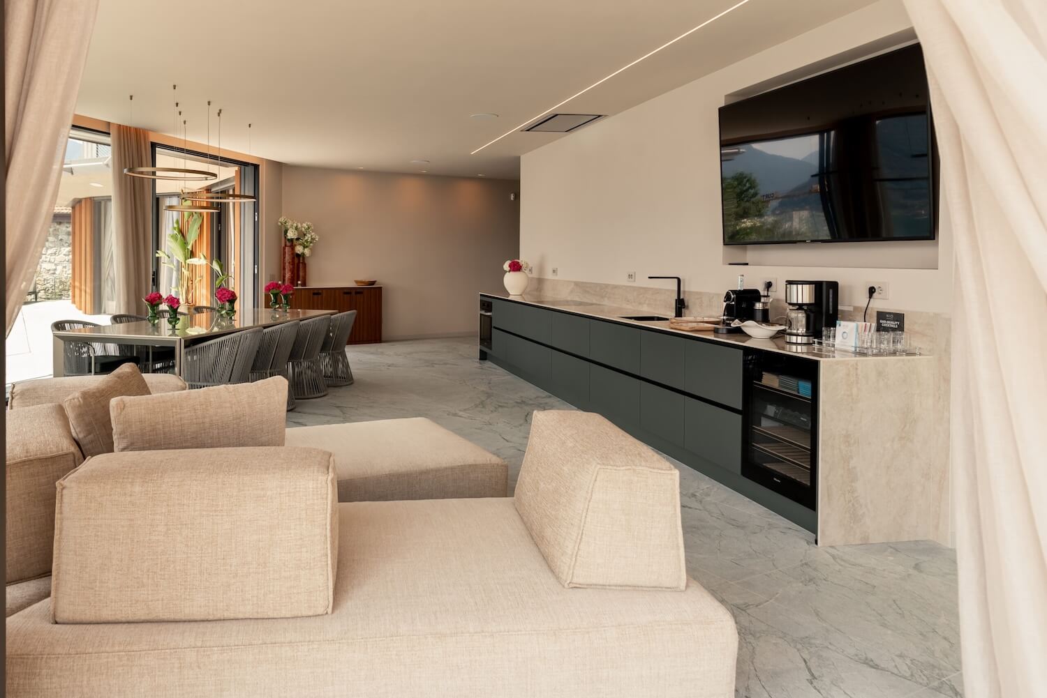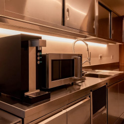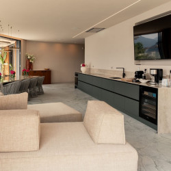 The main kitchen is modern and fully equipped with high-quality appliances including separate food and drinks fridge, ice machine, wine fridge and coffee machines.