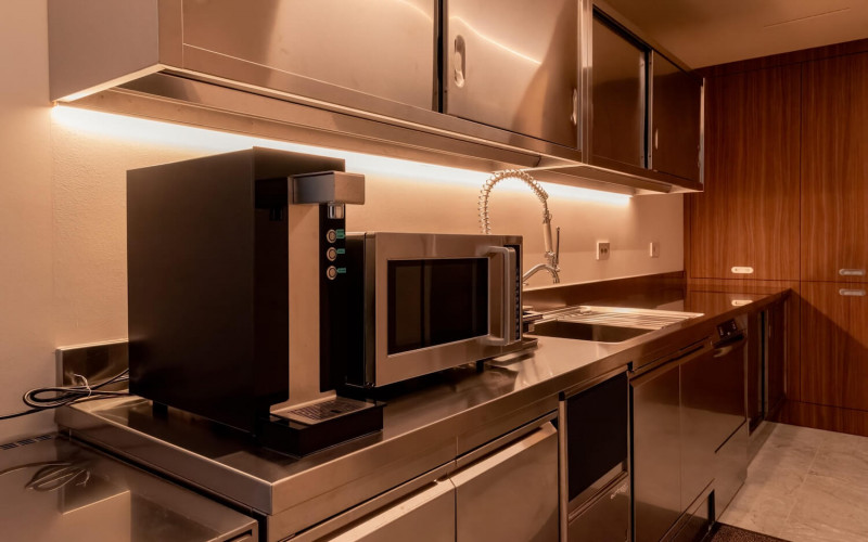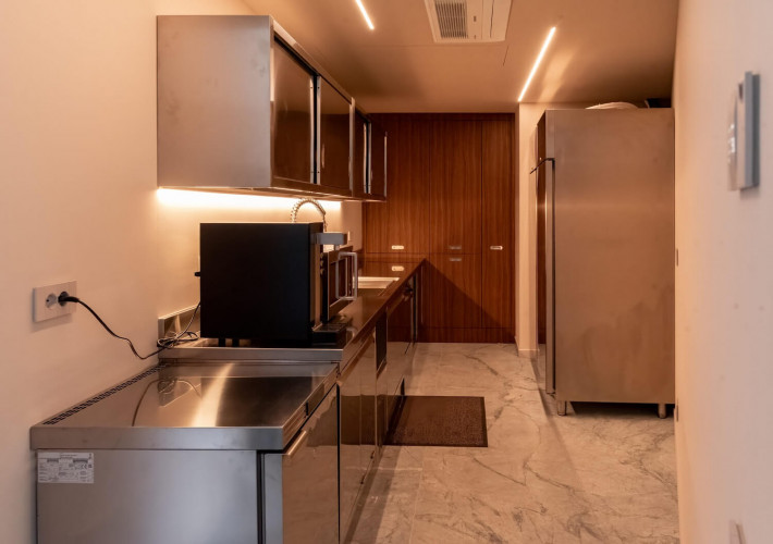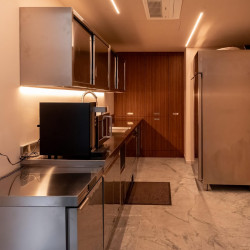 There is also a smaller, back kitchen fitted with professional dish washer and ideal for private chefs. It is the perfect space to collect, clean and reorder the kitchen in private, while guests enjoy a serene and seamless kitchen at the front.