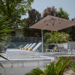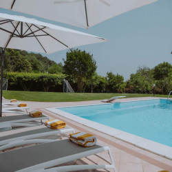The private pool with diving board measures 12m x 8m and is furnished with sun loungers and parasols. The pool has a shallow area for children and deeper water at the diving board.