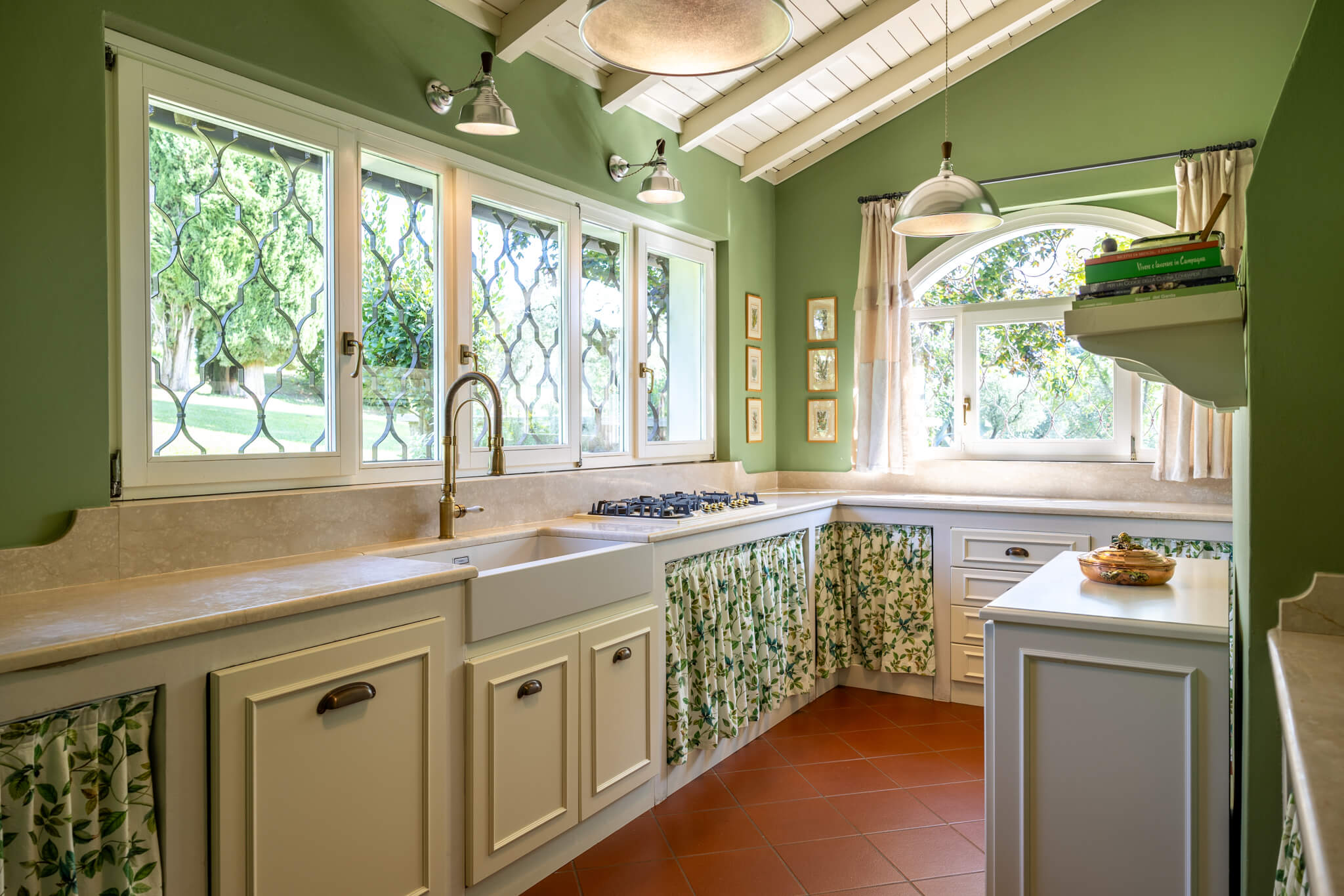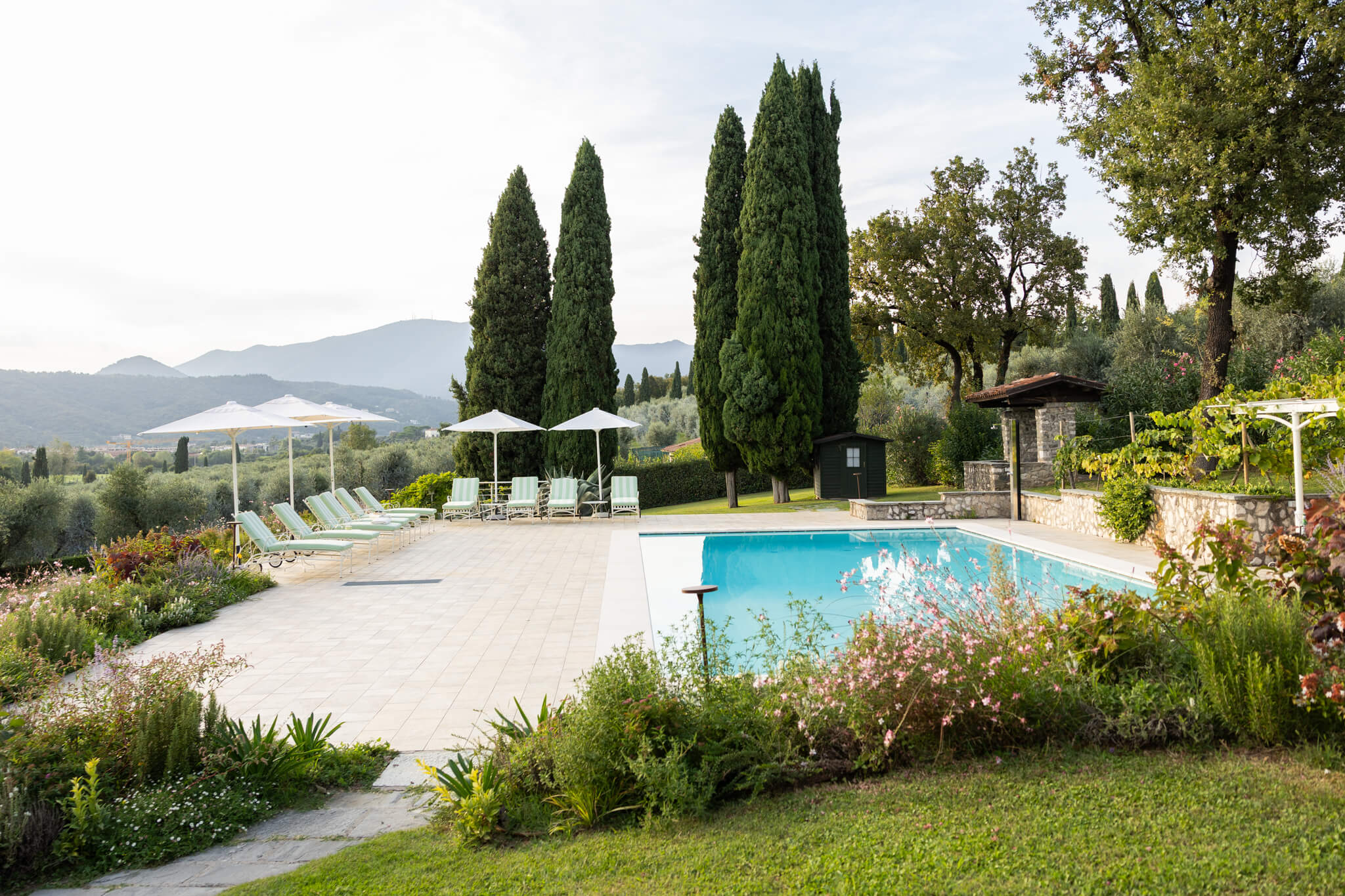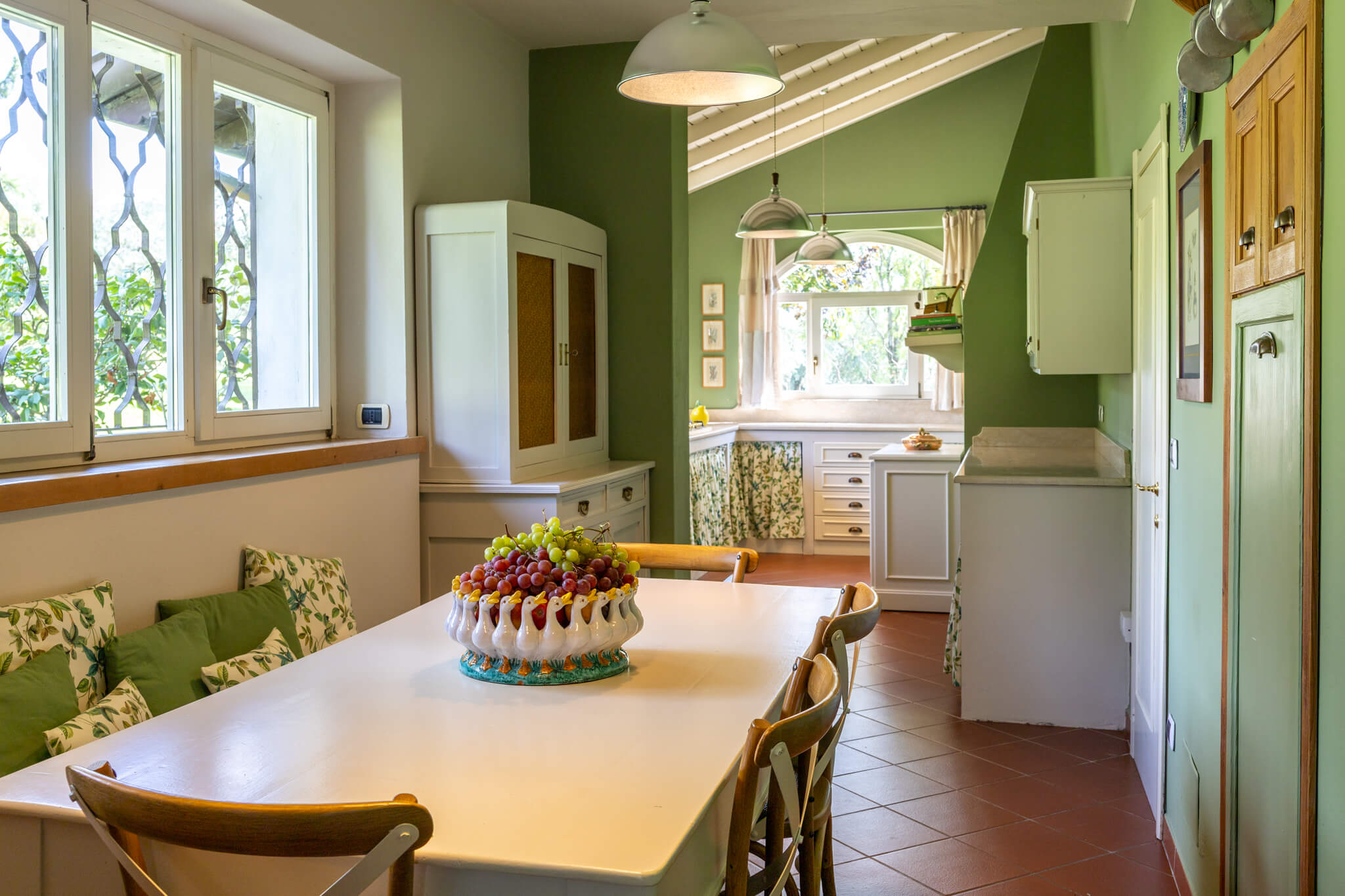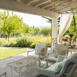 The heart of this stunning home is on the ground floor which hosts the living area and bright dining room and which opens on to the sunniest of the villas portici. There is a fully equipped kitchen on this floor as well as the study. In the dependance, there is a comfortable living room, looking over the gardens.
